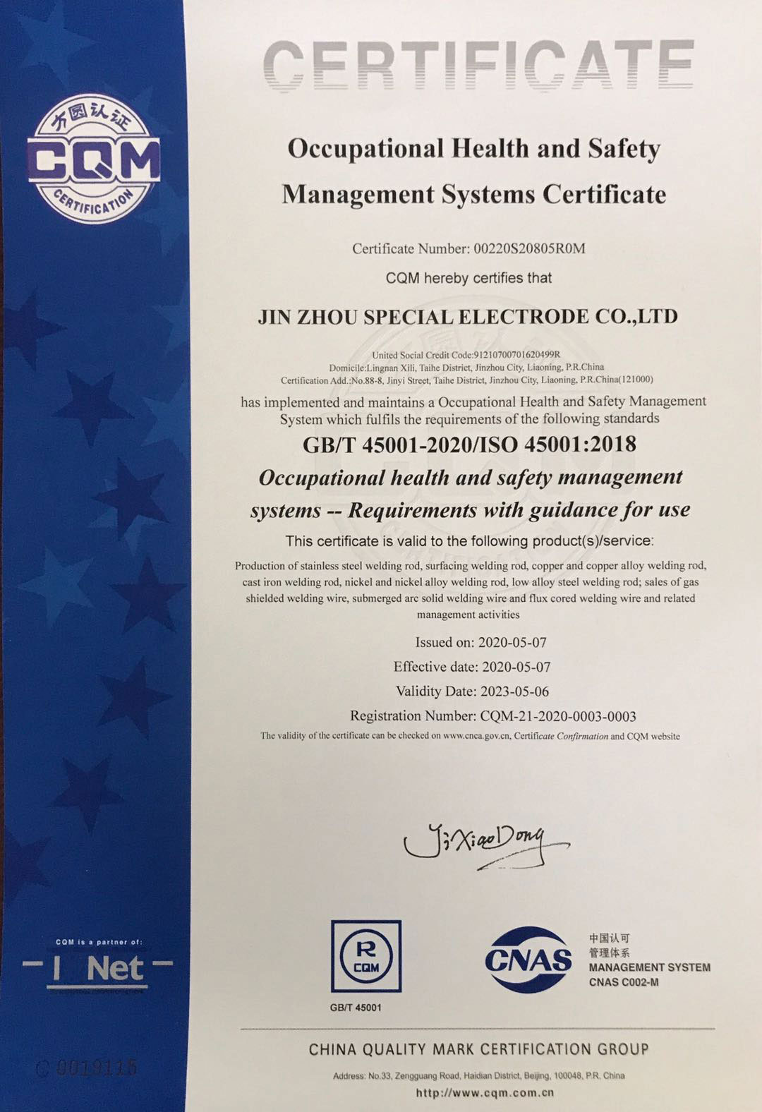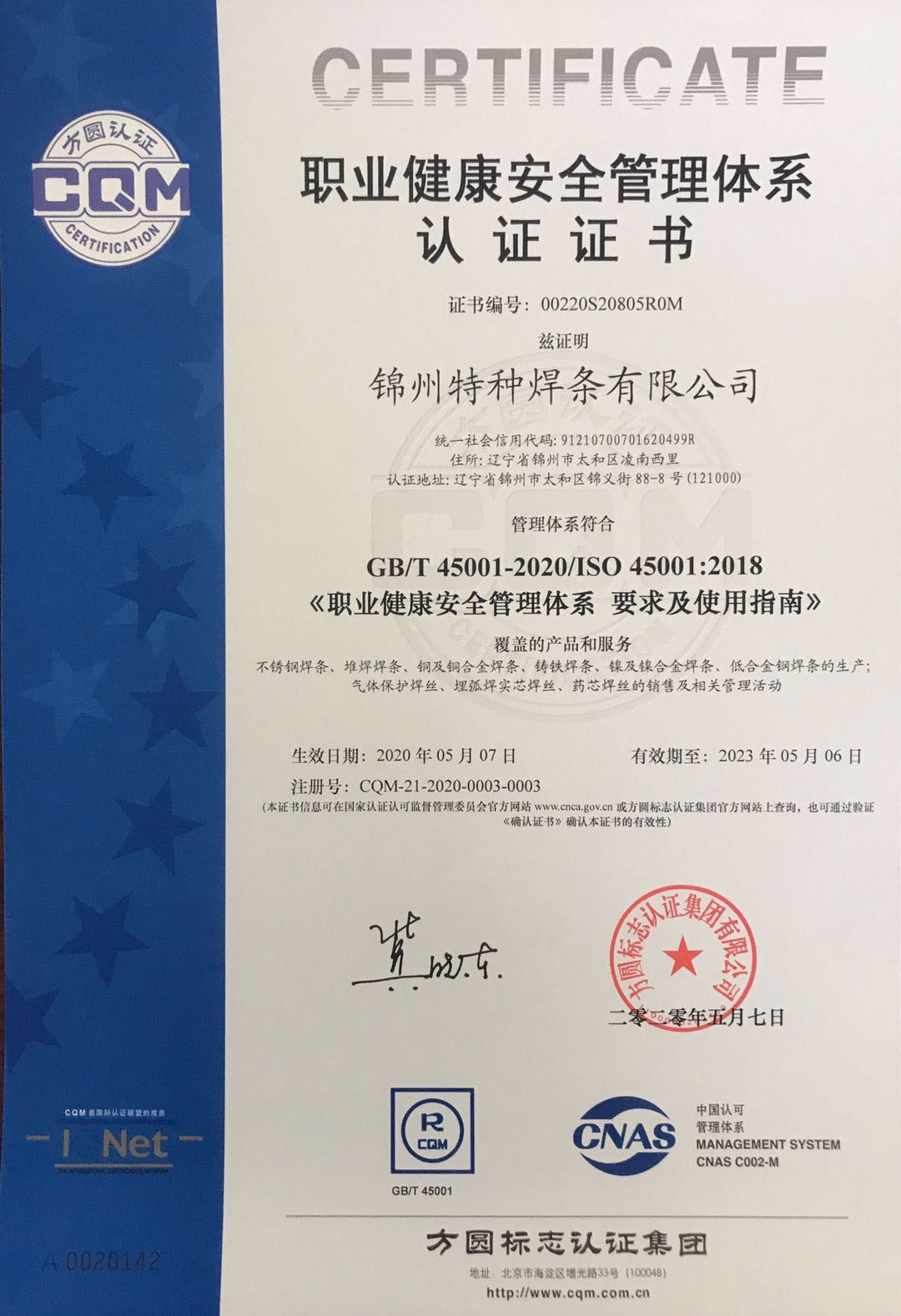 認證類別:GB/T 45001-2020/ISO 45001:2018 《職業健康安全管理體系 要求及使用指南》
