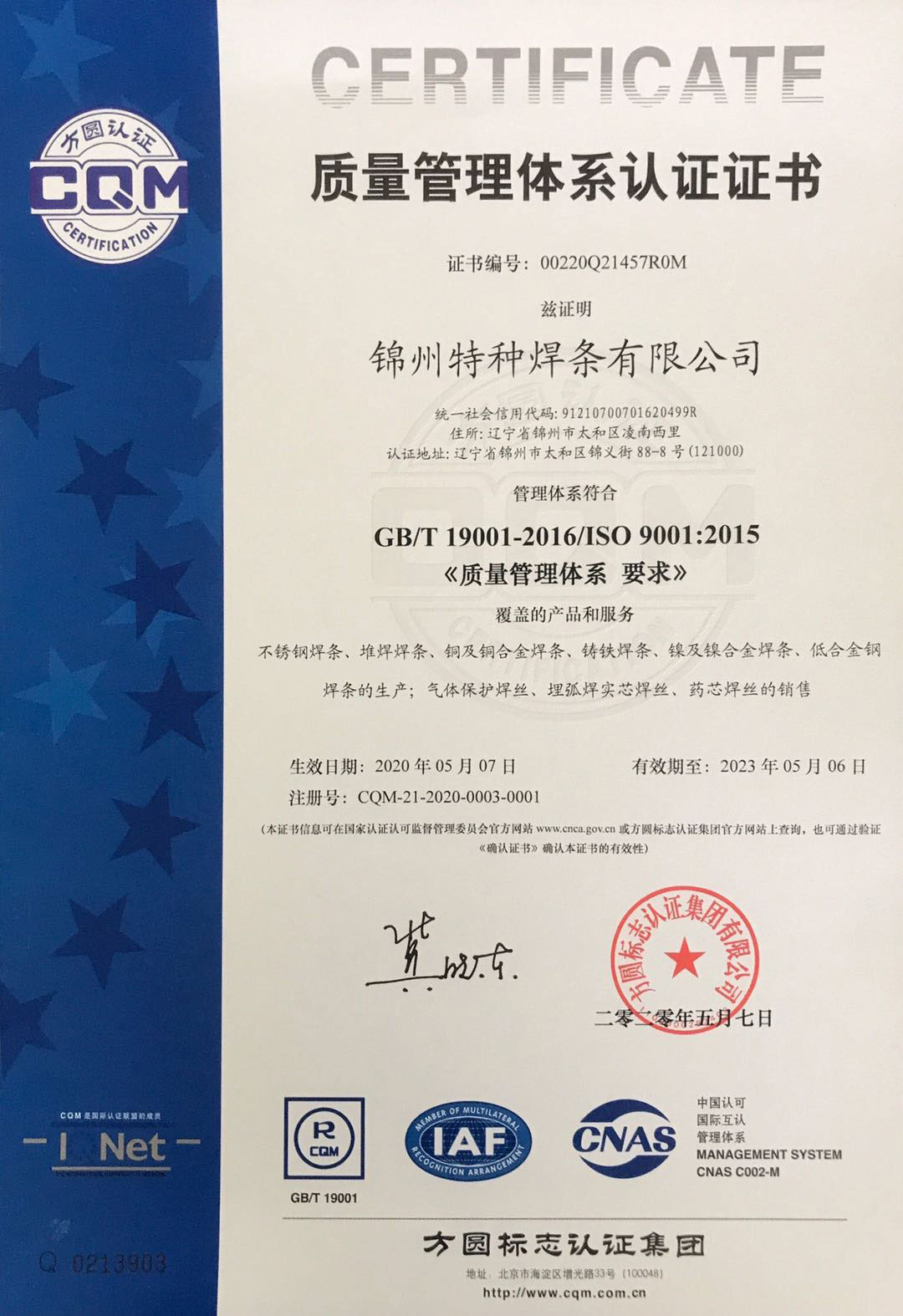 認證名稱:質量管理體系認證證書