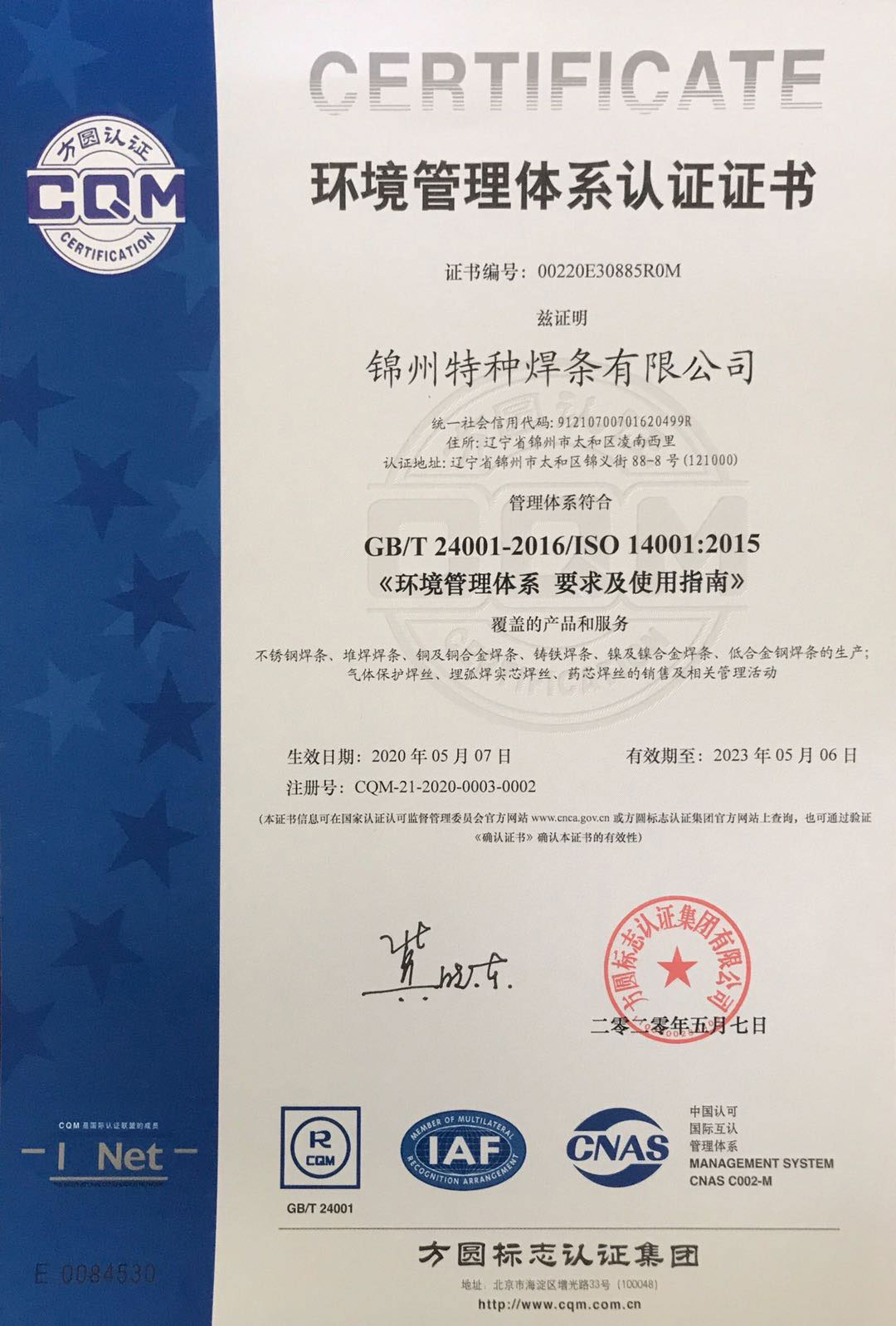 認證名稱:環境管理體系認證證書